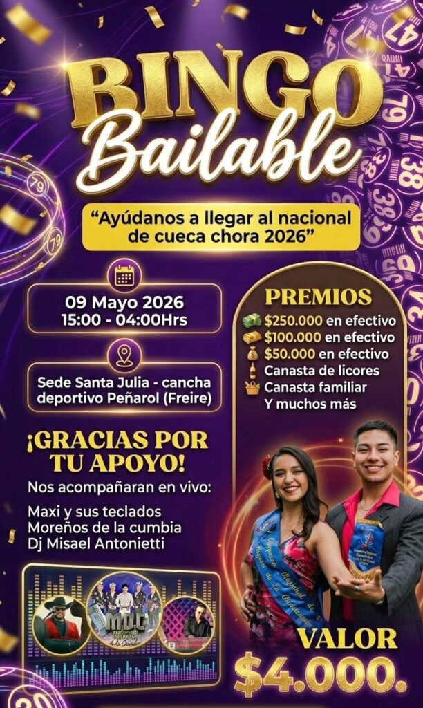 Una de ellas será un bingo bailable el próximo 9 de mayo en el sector Santa Julia de Freire, específicamente en la sede Peñarol, desde las 15:00 horas hasta la madrugada. Los fondos recaudados permitirán costear vestuario, traslados y otros gastos asociados a la competencia.