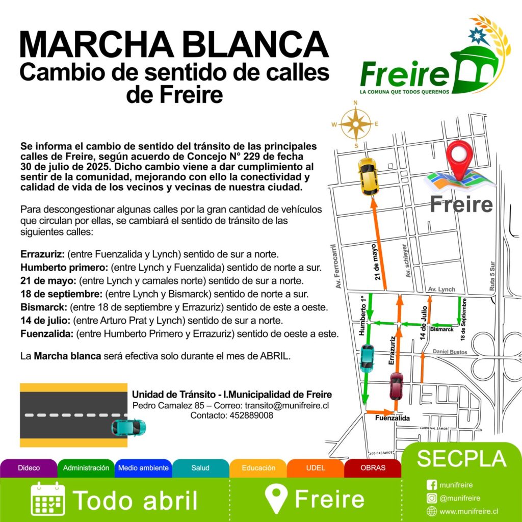 En el marco del proceso de reordenamiento vial impulsado por la Municipalidad de Freire, se han definido diversas modificaciones en el sentido del tránsito en calles del sector urbano. Estas medidas tienen como objetivo mejorar la circulación, aumentar la seguridad vial y optimizar los desplazamientos dentro de la comuna, y cuentan con la aprobación del Concejo Municipal mediante acuerdo adoptado en sesión ordinaria.
